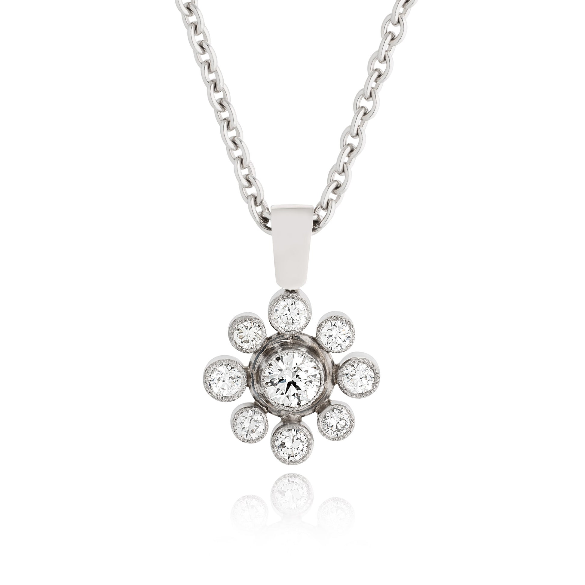 A bespoke 18ct white gold diamond cluster pendant with a detachable baroque pearl. Made to order, please enquire for pricing details.